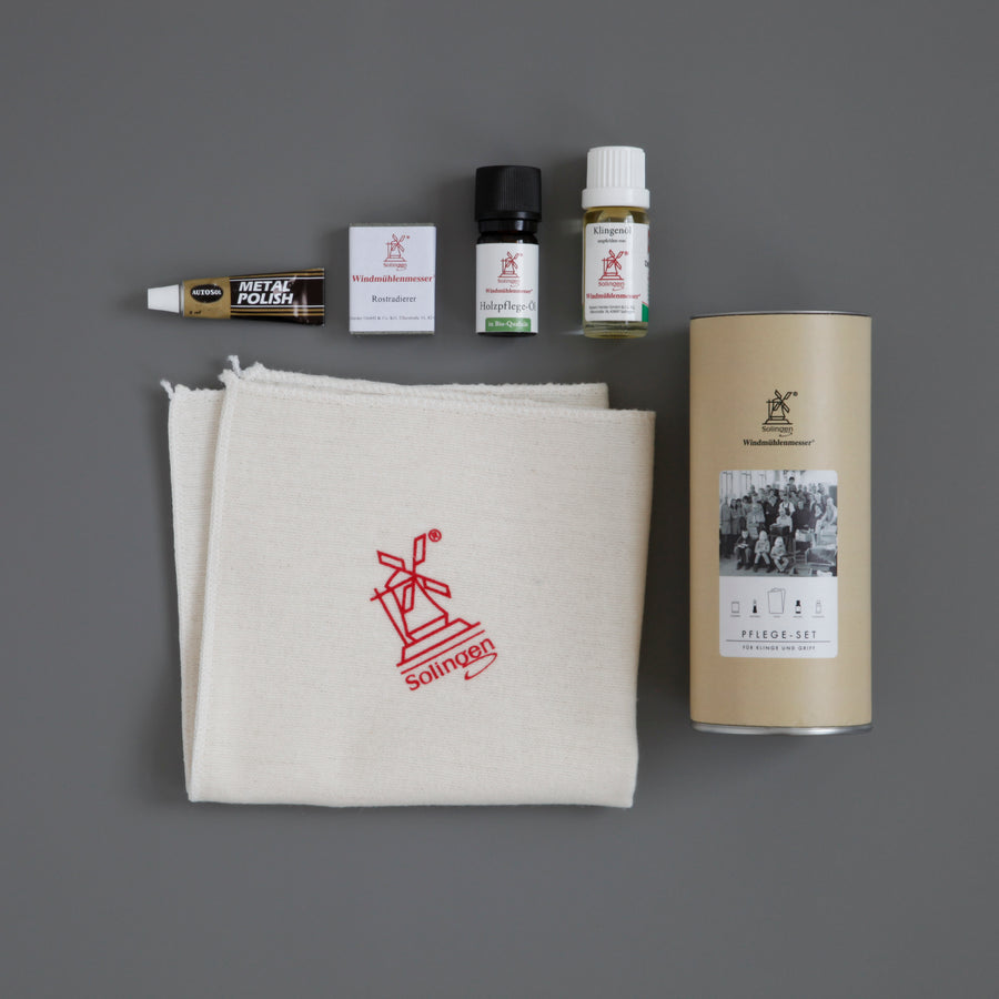 Keep your knives in tip-top condition with this handy knife care kit. The kit includes a rust eraser, metal polishing paste, organic wood care oil, blade oil and a soft cotton cloth for applying the above.