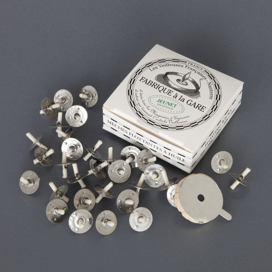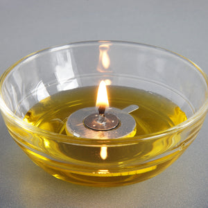A do-it-yourself tea light invented in 1838. Simply pour a small amount of vegetable oil into a glass and set the wick afloat on its cork holder. Each of these night-lights can burn for 24 hours.