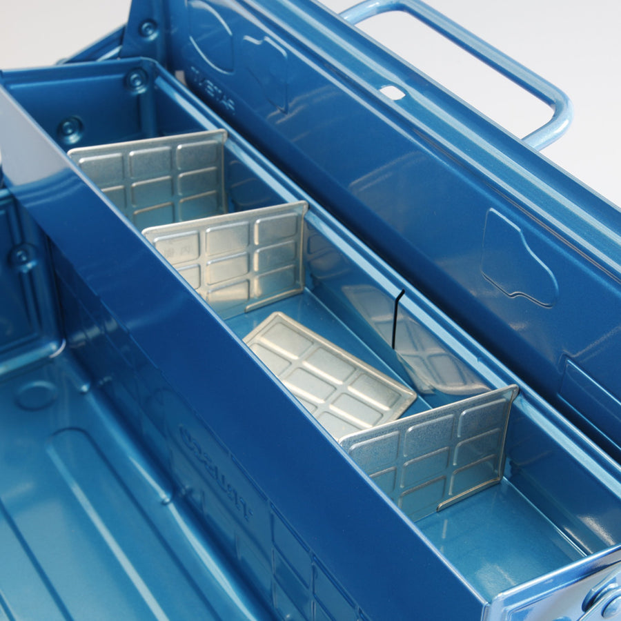 Like the larger variant, it features multiple compartments with adjustable dividers, and is robustly constructed from painted steel with a beautifully engineered opening mechanism.