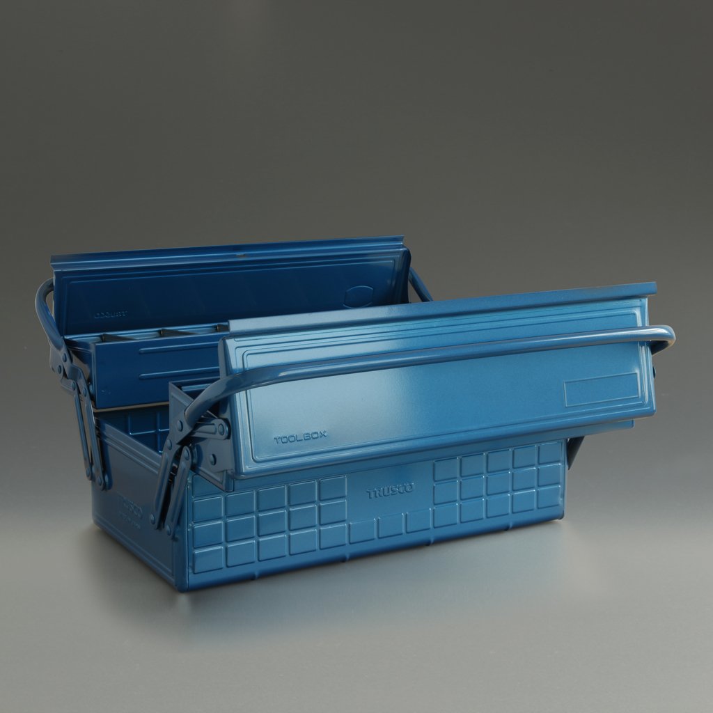 This cantilevered metal toolbox is made in Japan by Trusco and Toyo. It is robustly constructed from painted steel, and opens with a beautifully engineered mechanism.