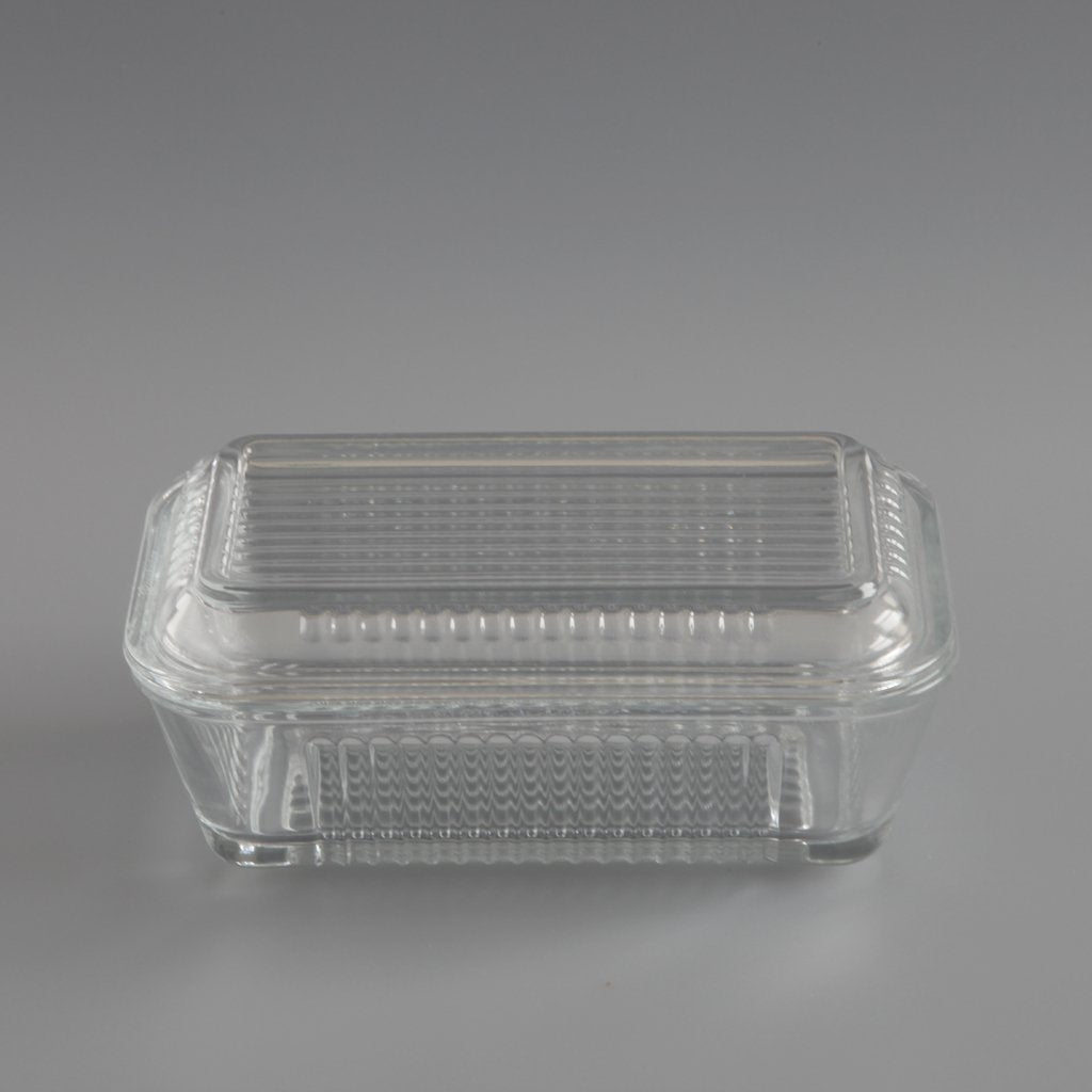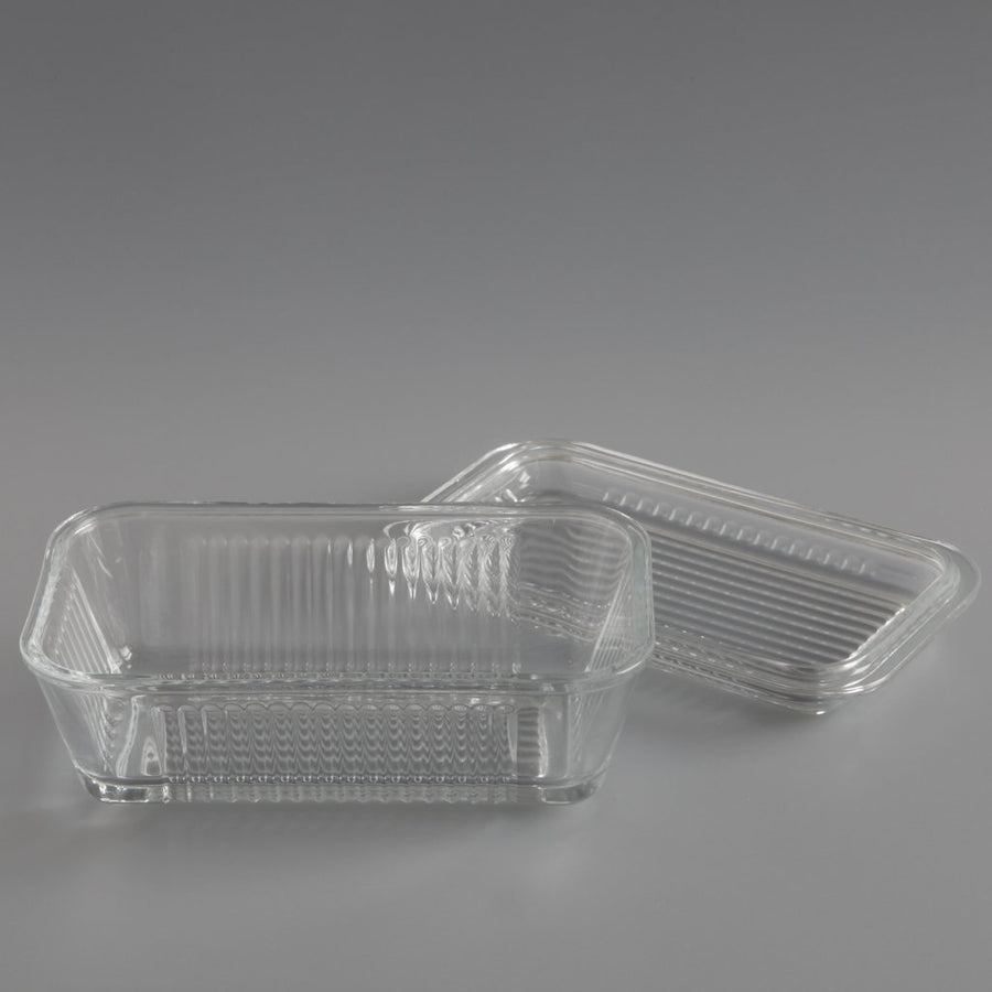 This is a no nonsense glass butter dish. Its satisfying shape means it can be used with the shallow dish as the base or the lid. Simple and practical.