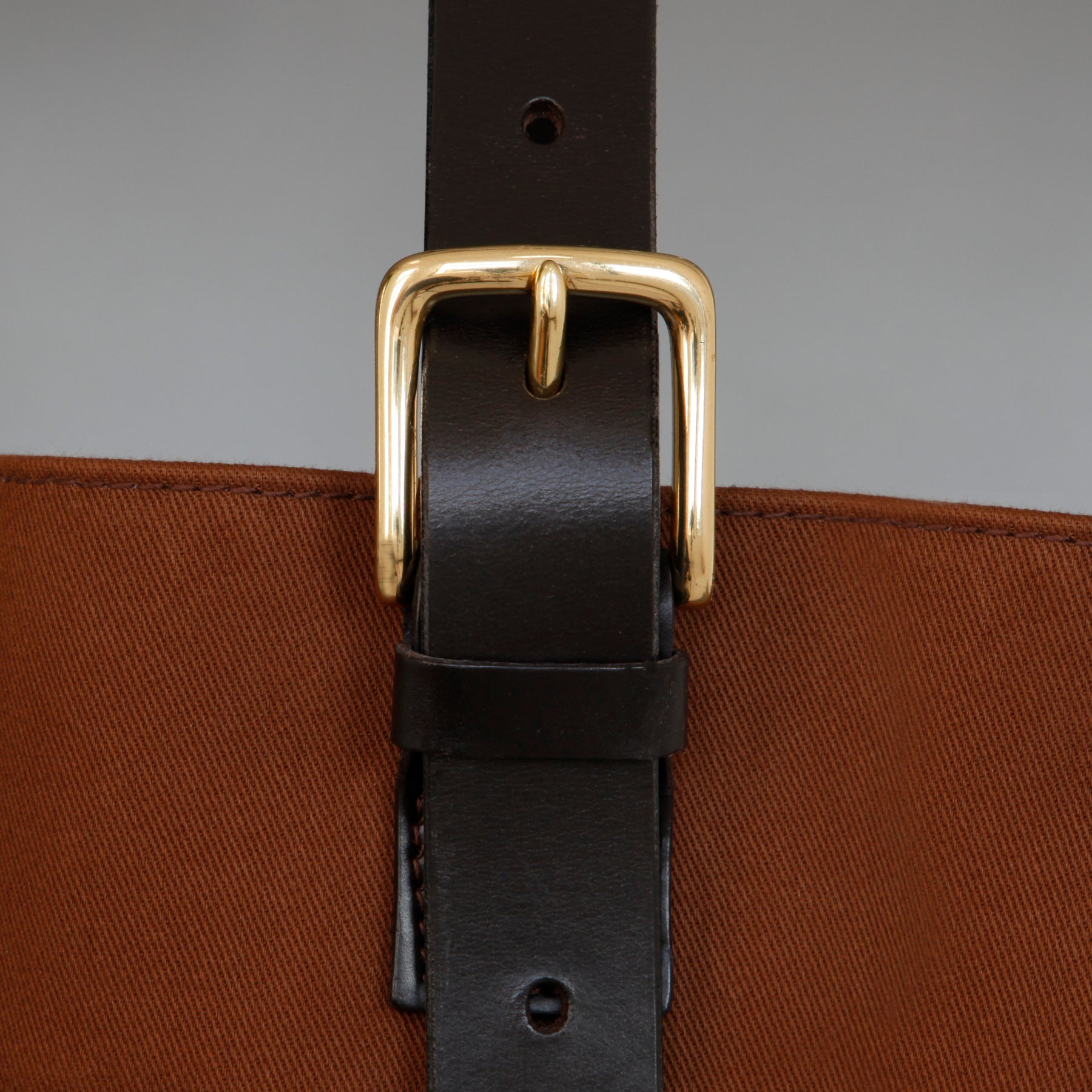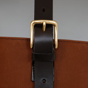 This capacious bag is handmade by Brady from their signature bonded canvas. It features an adjustable bridle leather strap with brass hardware. Inside the bag has one large compartment, and one smaller pocket, and closes internally with a brass clip.