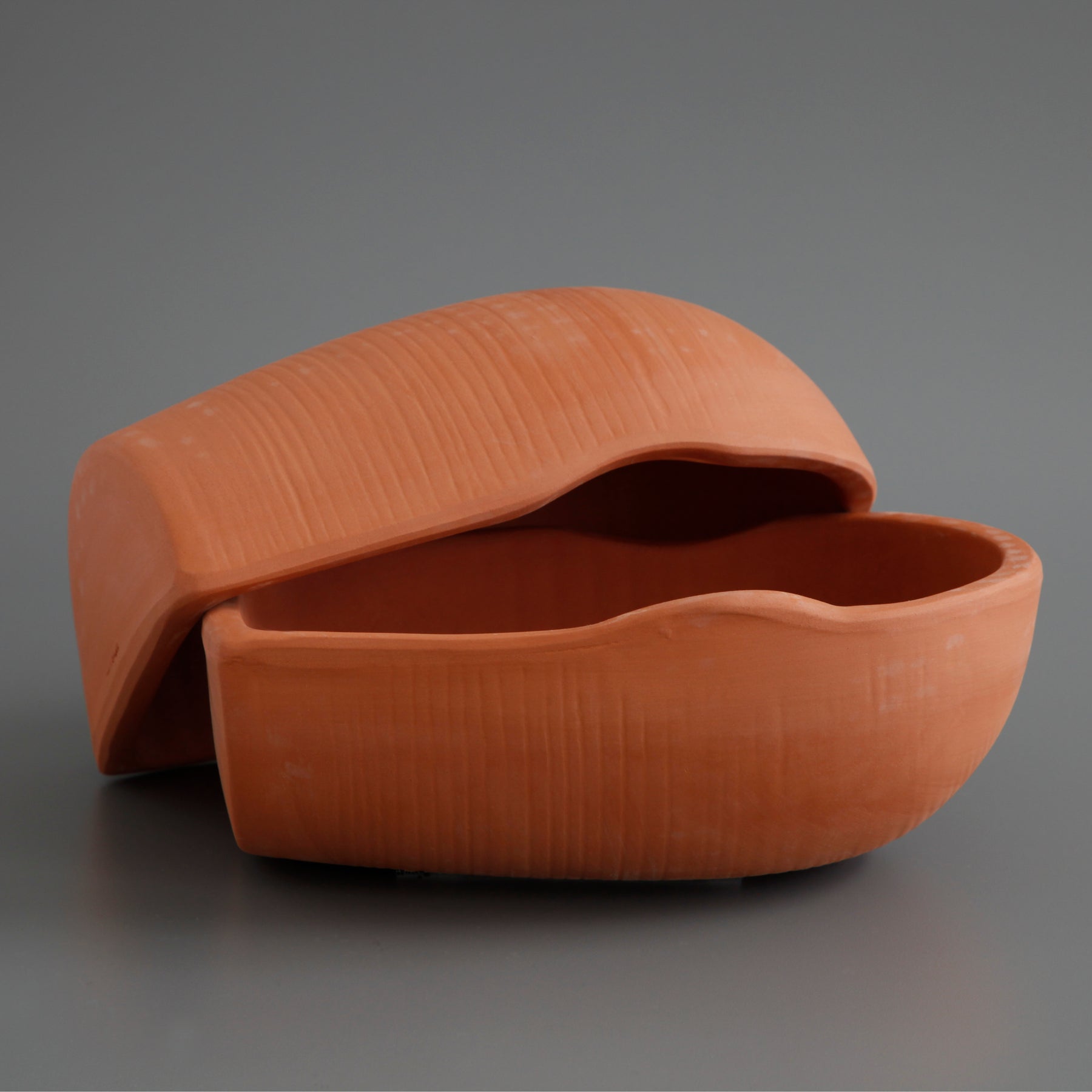 This terracotta chicken brick is a real classic of the 1960s. The chicken is cooked in its own steam and juices with no additional fat required. The brick is placed in a cold oven and the temperature set. The meat browns nicely inside the chicken brick, and stays moist.