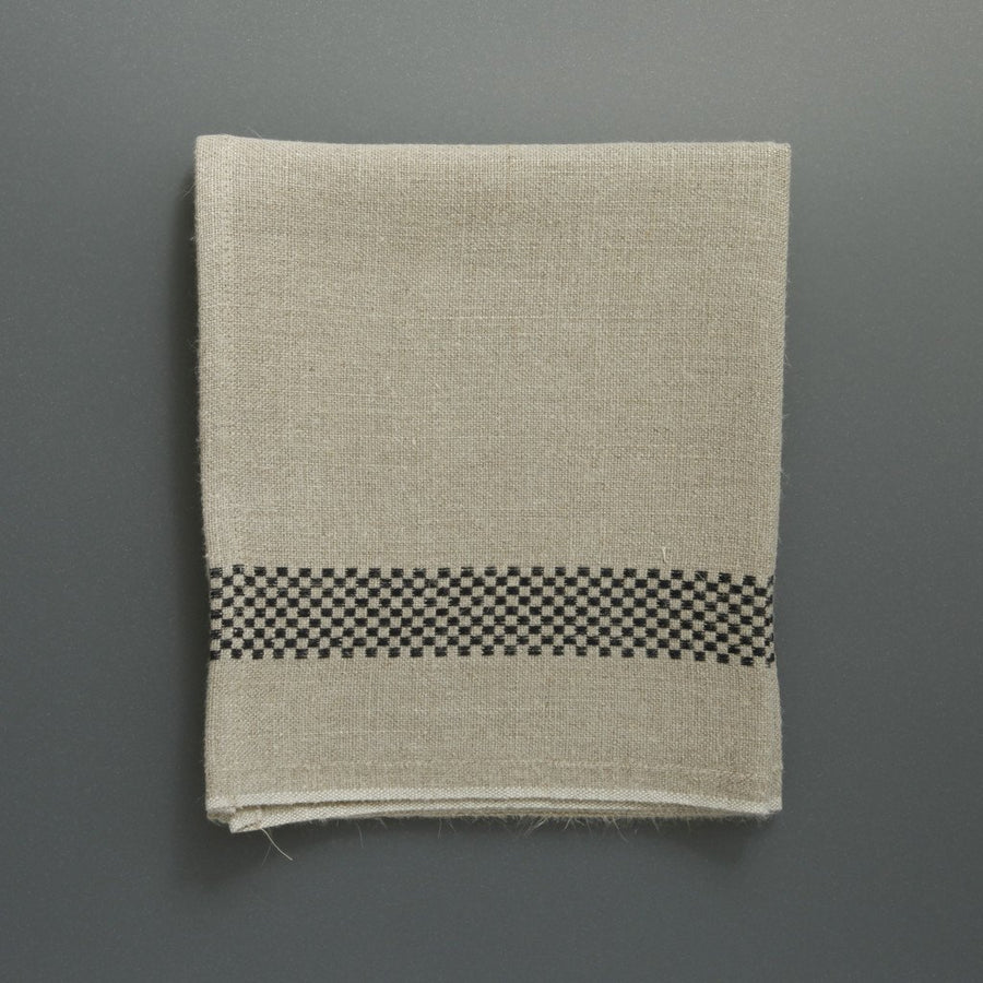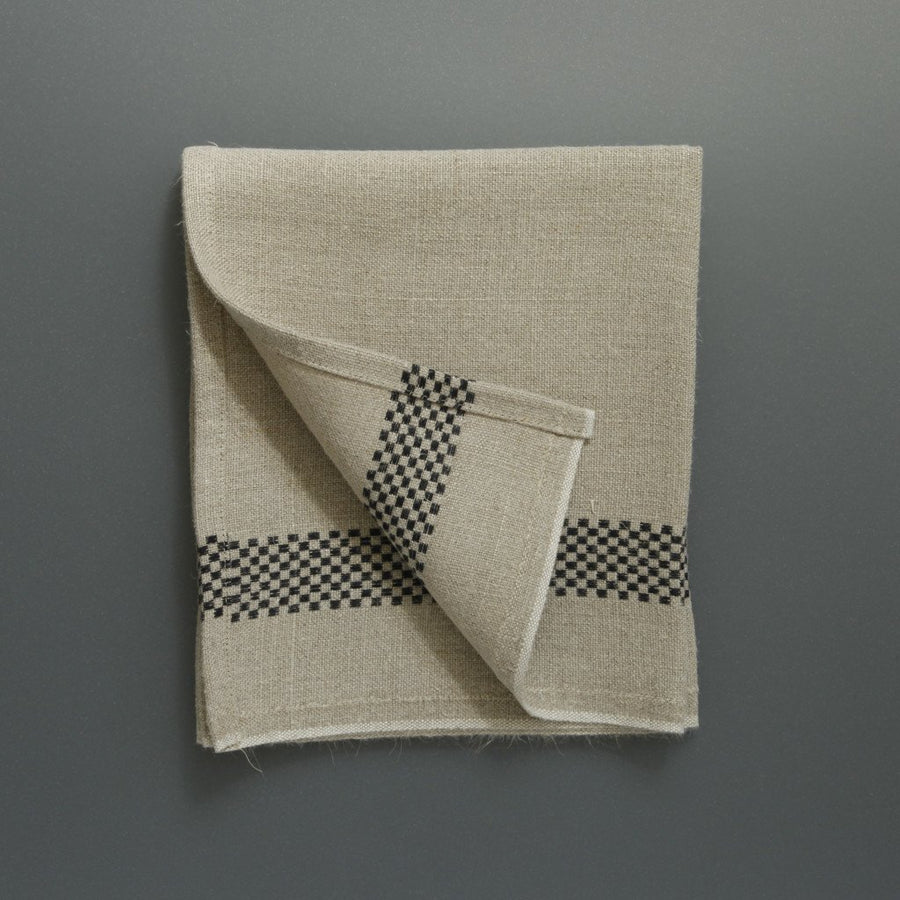 These robust tea towels are woven from natural undyed yarn with a jacquard patterned border in black. They will shrink slightly after the first wash.