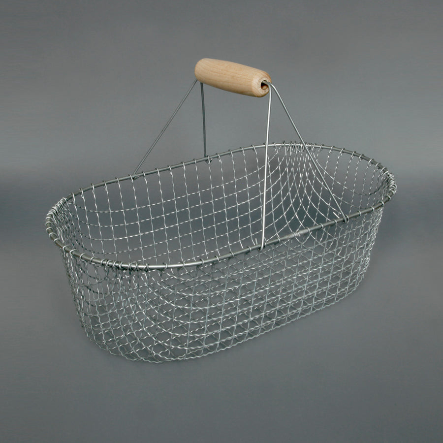 This garden basket was originally produced around 1910 for the agricultural industry for harvesting potatoes. It is ideal for gathering vegetables or flowers from the garden. The open mesh allows the loose dirt to fall off freshly picked produce.