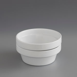 These bowls were designed as part of a system of stackable crockery by Nick Roericht in 1959 as his final thesis at the Ulm School of Design. The School was founded by former Bauhaus student Max Bill with many of its ideals, but with a more utilitarian style.