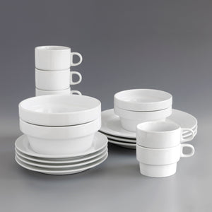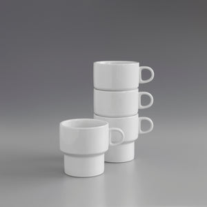 These mugs were designed as part of a system of stackable crockery by Nick Roericht in 1959 as his final thesis at the Ulm School of Design. The School was founded by former Bauhaus student Max Bill with many of its ideals, but with a more utilitarian style.