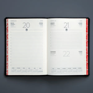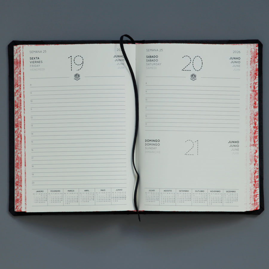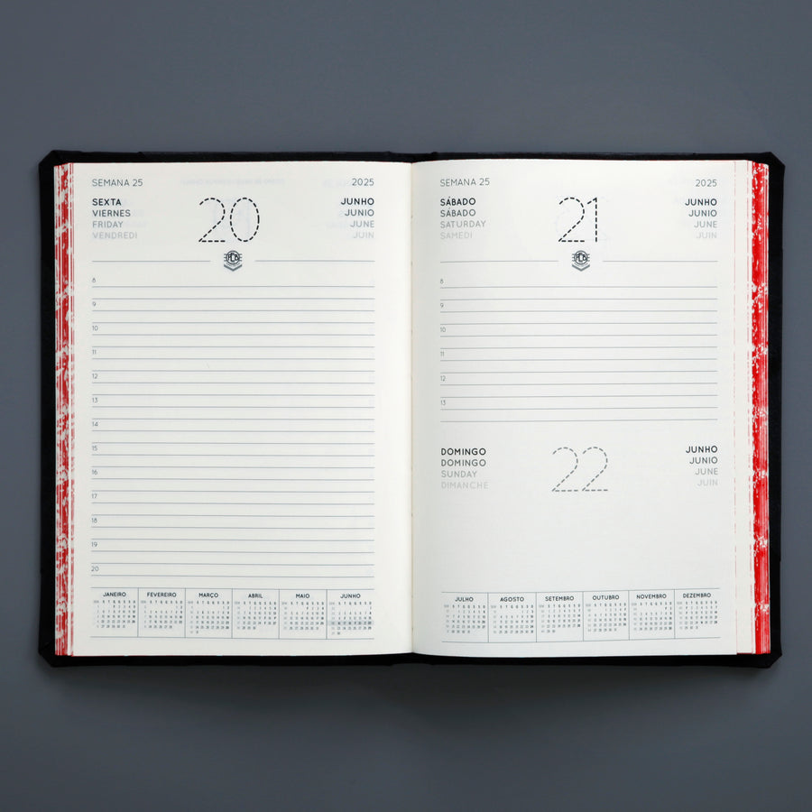 This handsome hardback diary is handmade in Portugal by a company who have been making stationery products for over a century. The robust design features cloth reinforced corners, an elastic closure and a nameplate which can be applied to the cover. The pages have hand marbled edges.